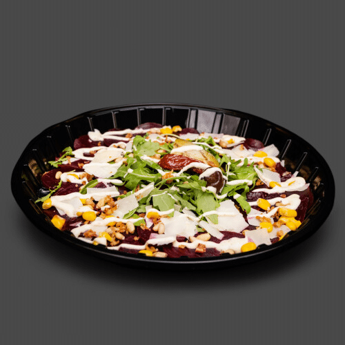 Onze Carpaccio salade combineert een heerlijke rucola sla met carpaccio, zongedroogde tomaat, Parmezaanse kaas, pijnboompitten en wordt afgewerkt met heerlijke toppings en truffeldressing.