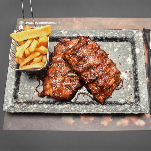 Smaak tussen zoet en hot (ongeveer 650 gram, 3 ribs). Inclusief patat